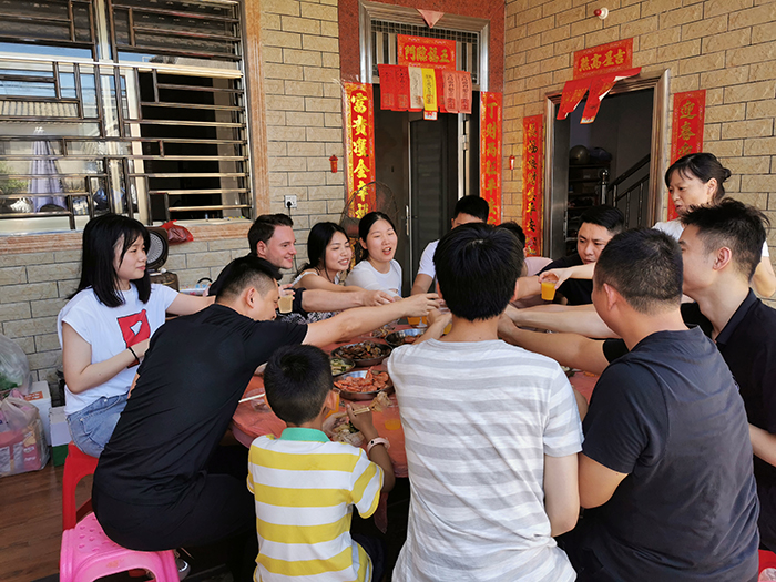 中午,我們進住民宿。安頓好行李后,我們共進午餐,感覺到生活的新鮮與愜意。豐盛的佳肴,濃香的美酒,讓我們沉浸在歡樂的氣氛中,享受著工作勞頓后帶來的無比快樂。舉杯,道聲辛苦了;舉杯,互致祝福。品生活芳香,享生活甘甜。團隊人不光在工作中有拼勁,而且在酒桌上也毫不含糊,舉杯,一飲而盡。